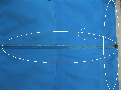 前下部分。ファスナー部分の擦れ。油のようなシミ。